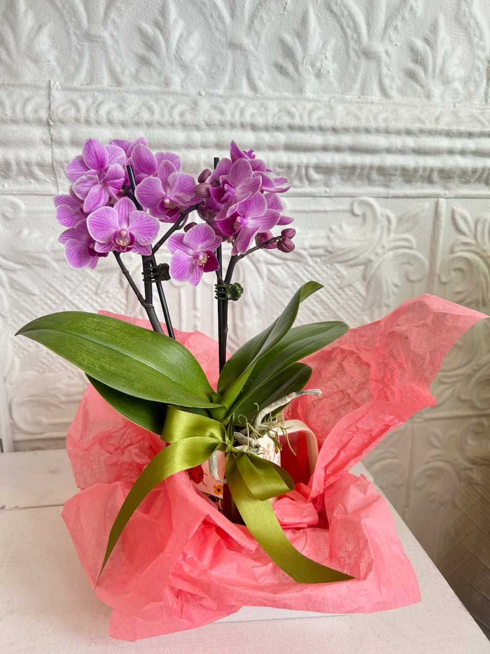 Each mini phalaenopsis orchid is carefully nestled with fresh moss and tied with a satin ribbon, making it the perfect gift to brighten her special day — and every morning after.