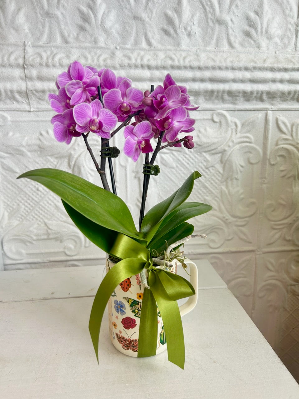 Celebrate Mom with something as sweet and stylish as her morning coffee with our Love You A Latte special. This petite orchid arrangement is beautifully planted in a Rifle Paper Co. x Corkcicle Garden Party mug, combining vibrant living beauty with a keepsake she'll treasure for years.