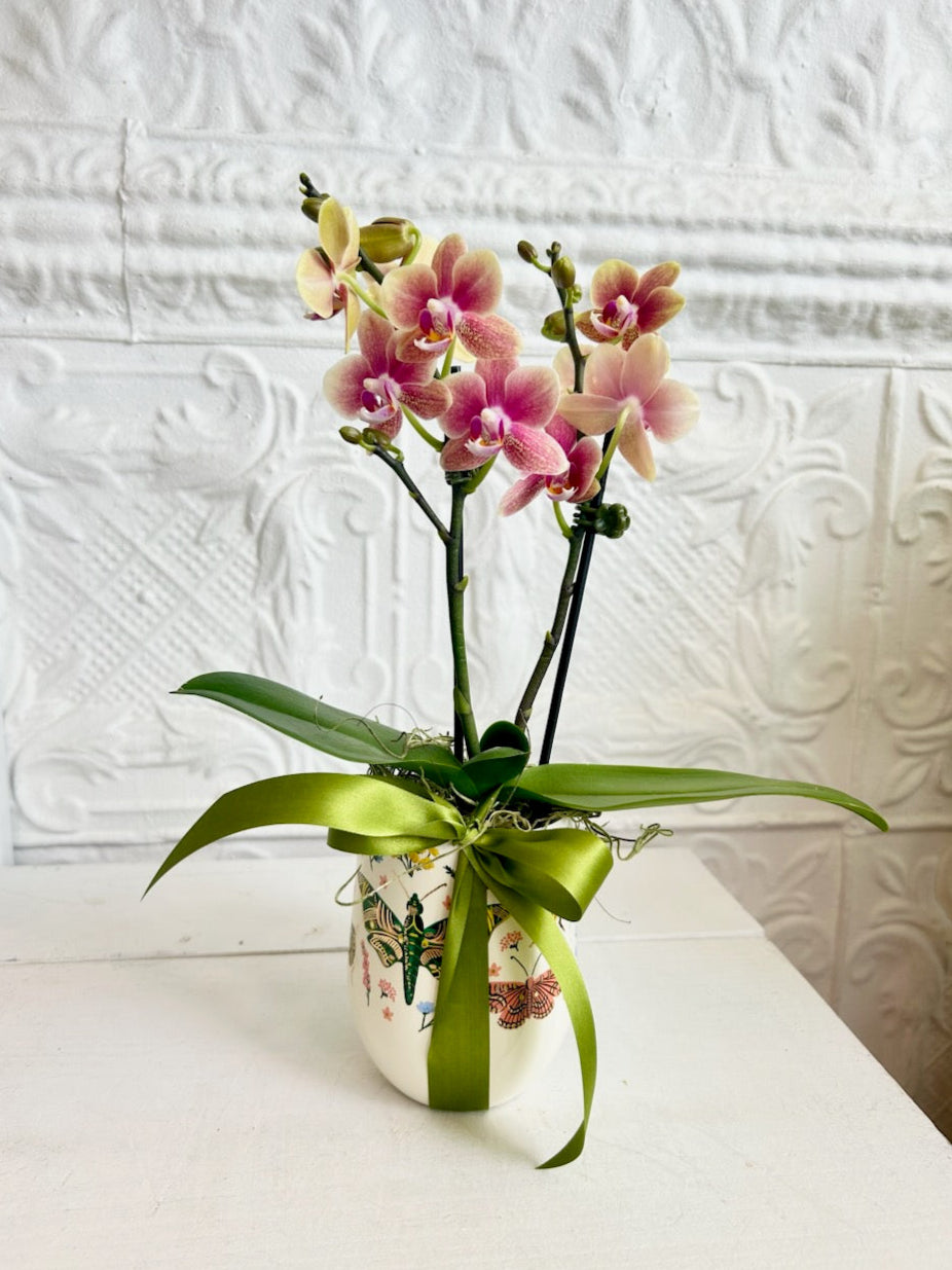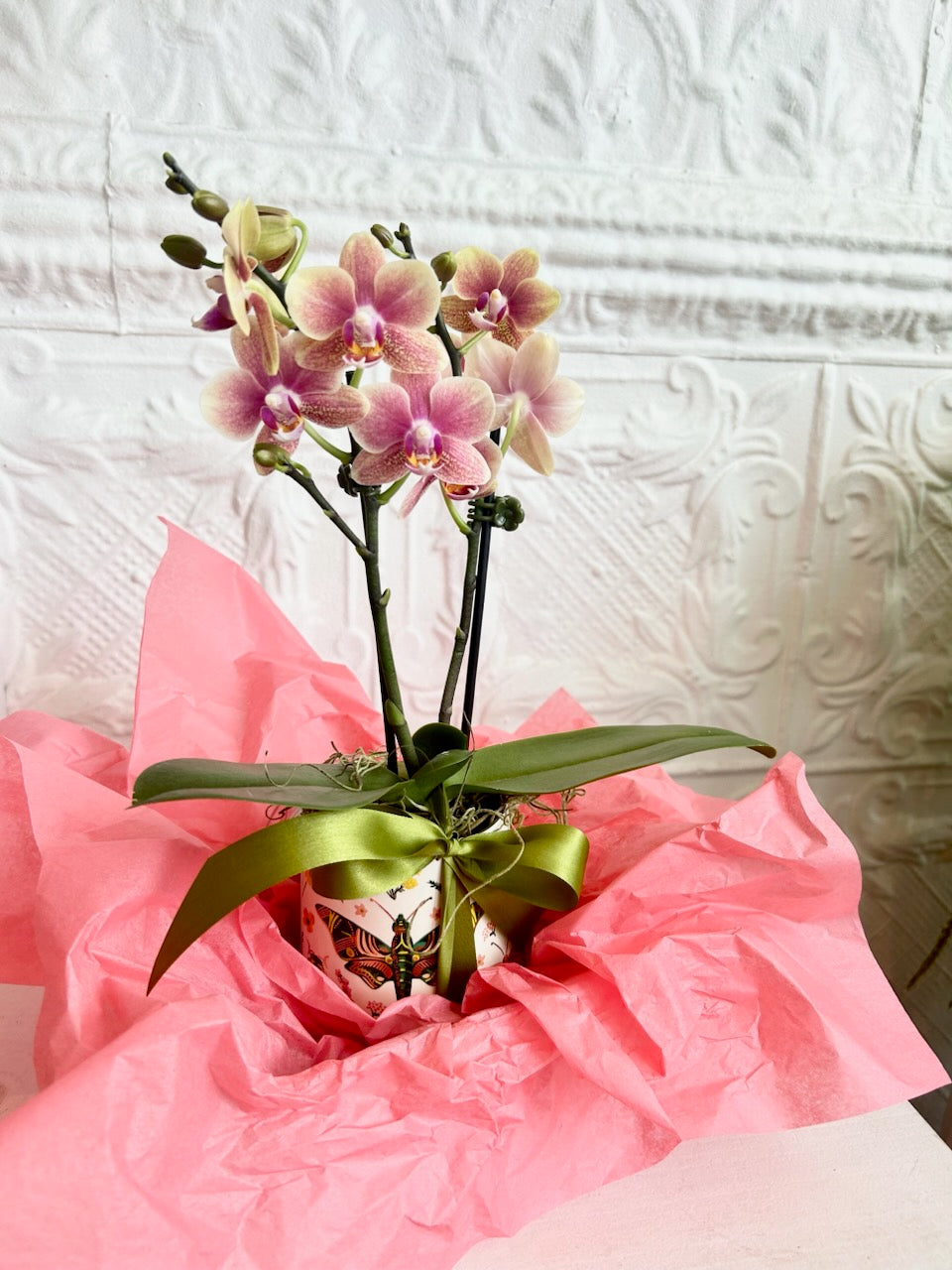 Each arrangement features a delicate mini phalaenopsis orchid, expertly planted with lush moss and tied off with a satin ribbon for a cheerful finishing touch.